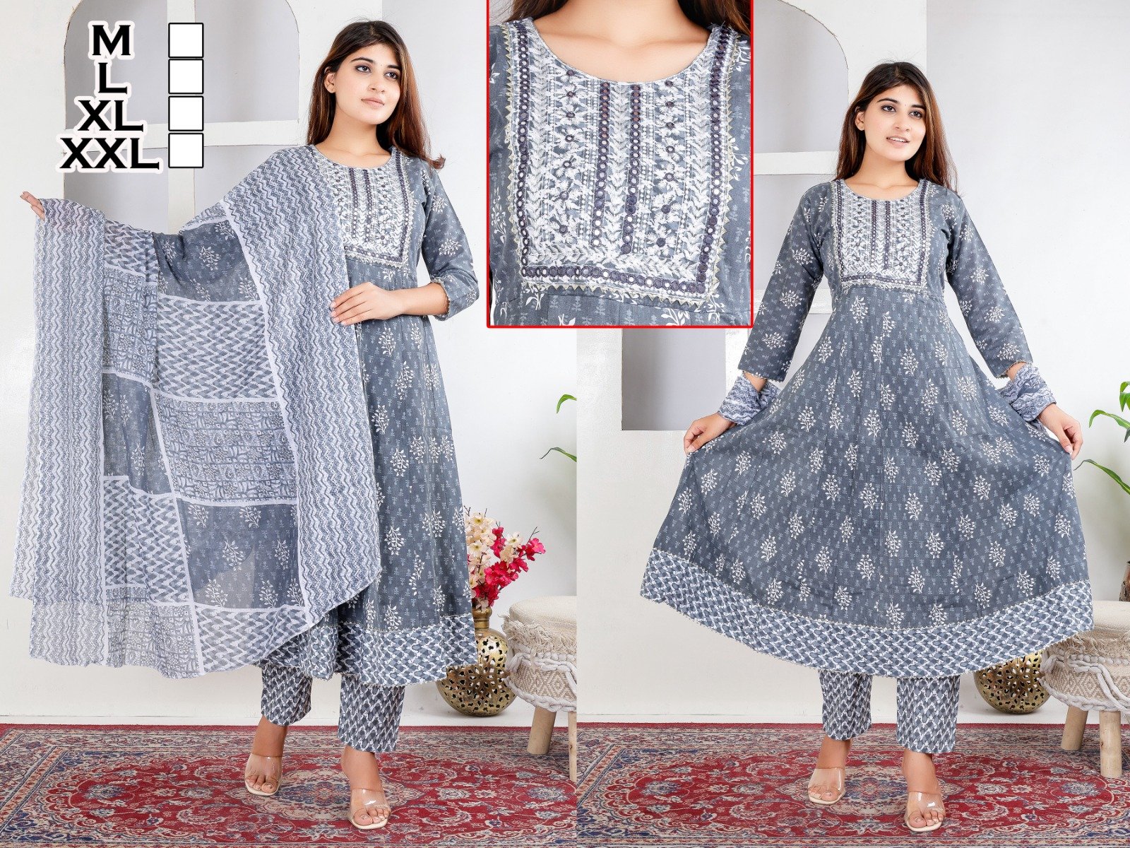 - Elegant Design: Grey and white floral print Anarkali kurta.