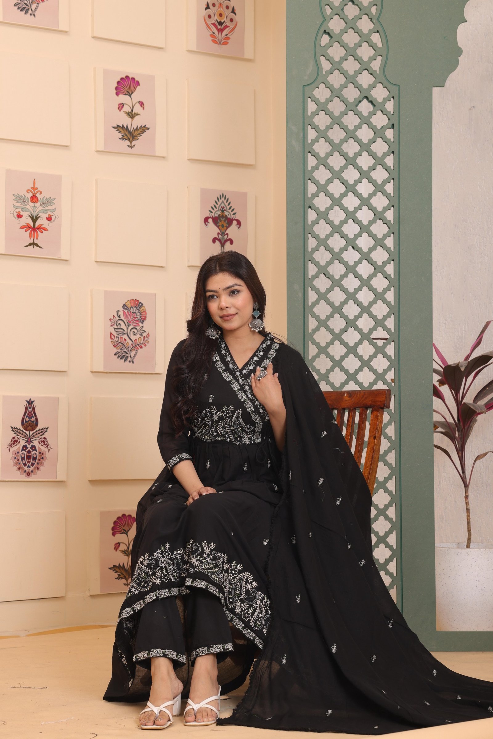 Printed Anarkali Kurta, Bottom & Dupatta Set (Black)